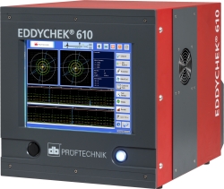 正面にタッチパネル式パソコンを装備。電源コンセントAC100-240Vを準備すればすぐに使用できます。フルデジタル対応となった新しい時代の渦流探傷装置です。最大10チャンネル、8個の探傷プローブを制御が可能な高性能な装置です。 従来の装置より大幅な信号処理能力の向上により、生産ラインの刷新を可能とします。 |